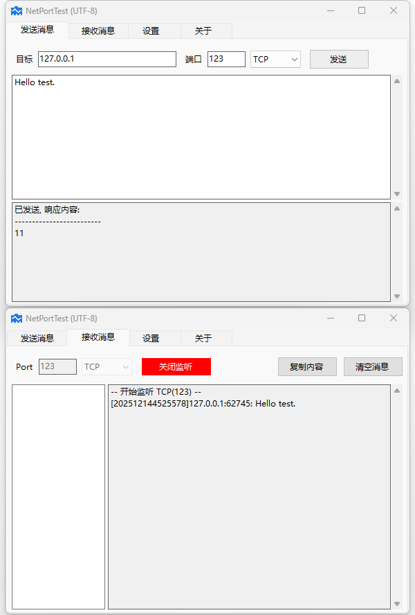 可对本机指定端口(TCP/UUP)开启监听,并接收消息,接收到TCP消息自动回复接收消息长度。