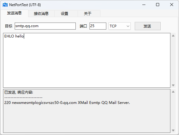 可向指定地址发送UTF8文本消息。测试对方端口是否开放及能否接收到消息。相比telnet,可发送UDP消息。