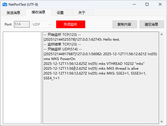 可对本机指定端口(TCP/UUP)开启监听,并接收消息,接收到TCP消息自动回复接收消息长度。